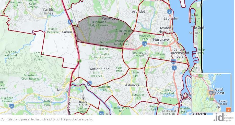 Parkwood is characterized by leafy, green streets, well-kept gardens and detached homes, the majority of which are owner-occupied or rented. The suburb as a whole was developed in the last 20 years and falls under the Gold Coast City Council Division 6.